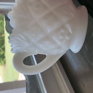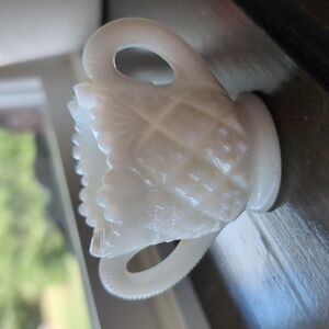 Vintage Milk Glass Sugar Bowl or Toothpick/ Matchstick Holder. The brand is probably Westmoreland but it is unmarked or missing the sticker. It glows a soft green under a 365 nm blacklight. It is approx 2" H x 3.5" W and it is in great condition. No cracks or chips.