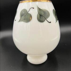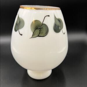 Add timeless charm to your space with this vintage mid-century milk glass vase, featuring hand-painted green leaf accents and a lustrous gold rim. The opaque white glass and elegant pedestal base give it a soft, romantic feel—perfect for Hollywood Regency, cottagecore, or retro-inspired decor.