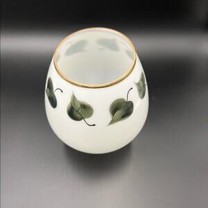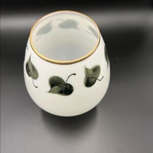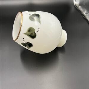 Vintage Milk Glass Vase with Hand-Painted Green Leaves and Gold Rim