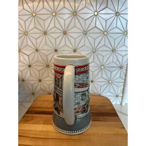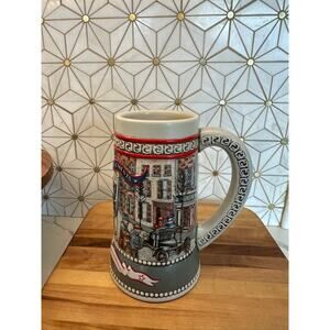 This collectible stein showcases intricate raised detailing, bold patriotic colors, and a vibrant depiction of the event, making it an ideal gift for automotive enthusiasts, history buffs, or beer stein collectors.