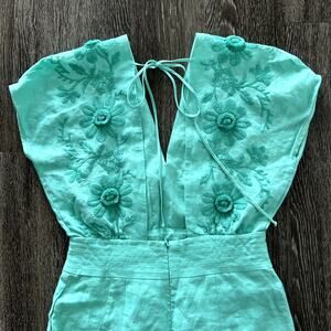 Milly of New York Linen Embroidered Floral Green V-Neck Dress Sz 8 Vintage Lined