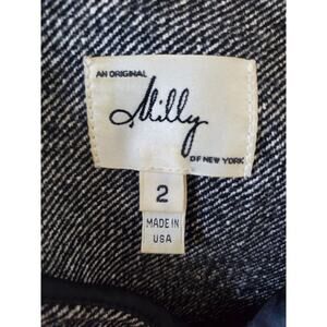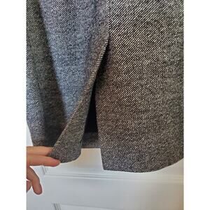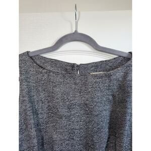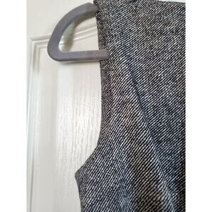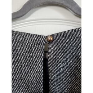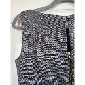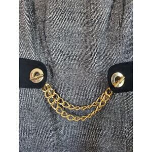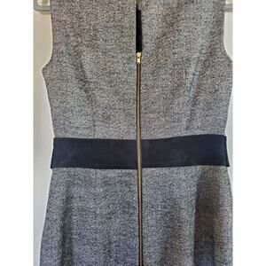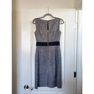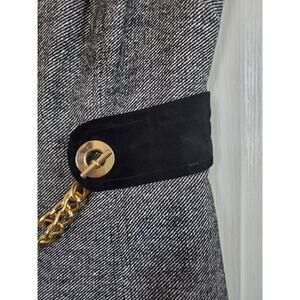 Style: Tweed knee-length dress with gold chain accent. Boatneck, sleeveless. Fully lined. Keyhole back with exposed zipper. Professional vibes. Waist has black suede accents on both side connected by a chunky gold chain. Heavy, textured material. Made from fabric imported from Spain. Made in USA. Dry Clean Only with Leather Specialist. 46% Wool, 26% Cotton, 27% Silk, 1% Lycra. Black belted accent is 100% Suede. Lining is 100% Acetate.