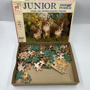 Vintage Milton Bradley junior jigsaw puzzle with over 100 interlocking pieces, adorable kitten scene. Puzzle has not been put together and verified all pieces are there, sold as is.