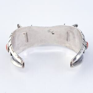 This striking vintage watch cuff showcases traditional Zuni craftsmanship with bold turquoise and coral cabochons set in sterling silver. Designed by renowned silversmith Milton Lasiloo, it features bear paw appliqués that evoke strength and spirit. A meaningful and collectible piece for fans of Native American art and jewelry.