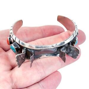 Vintage Milton Lasiloo Native Zuni Sterling Silver Turquoise Coral Watch Cuff 6"