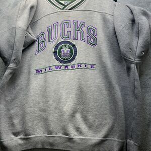 Item: Vintage NBA crewneck sweatshirt with classic Milwaukee Bucks logo and wordmark across the chest.