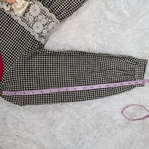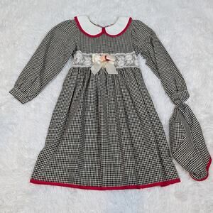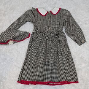 Charming vintage Mimi Fashion girls dress, made in the USA. Features a classic black and cream gingham pattern, contrast scalloped white collar with red trim, long sleeves, and a full pleated skirt. The waist is accented with floral lace detailing and a satin bow with rosette appliqués. Includes matching bonnet with coordinating trim and fabric flower. Cotton-poly blend with beautiful structure and vintage craftsmanship.