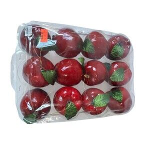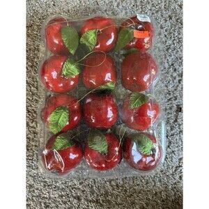 A set of 12 red apple Christmas ornaments. Brand: Sears The ornaments are designed to look like apples with a glossy red surface, green leaves, and a gold string for hanging.