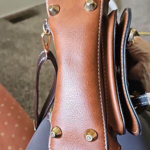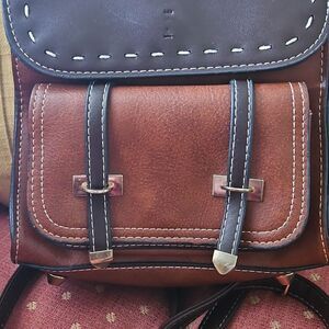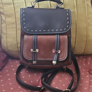 Mini Bumblebee Vegan leather brown and black backpack/handbag with front snap close pocket, inside zippered pocket, zippered closure for the bag, the front flap has two snaps for closure,and four legs. The bumblebee is missing from the front but you can see where it had been but otherwise it's in great previously owned condition.