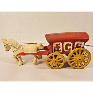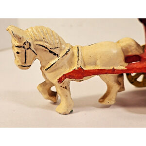 Vintage Mini Cast Iron White Horse Drawn Red Ice Cart 7" Buggy Wagon Farmhouse