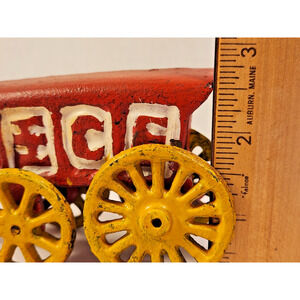 The Vintage Cast Iron White Horse Drawn Red Ice Cart 7" Buggy Wagon Farmhouse is a charming and nostalgic toy suitable for children aged 8 and above. This handmade, vintage toy features a miniature ice cart made of durable cast iron, perfect for imaginative play scenarios on the farm or at the cottage. With its unique design and vintage appeal, this toy will surely delight boys and girls alike who enjoy collecting antique and classic toys. Made in the United States, this toy brings a touch of wistfulness to playtime.Please look at all the photos as they are part of the description. Please email with any questions.