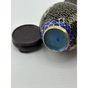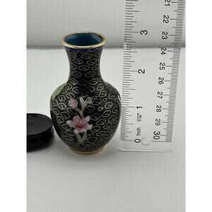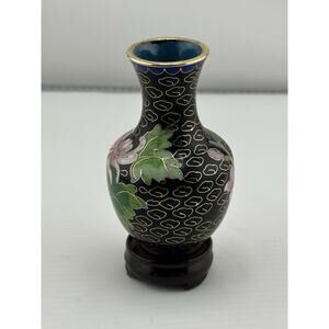 This vintage mini Chinese enameled cloisonne vase with stand, measuring 3 inches tall, features intricate floral designs on a black background with blue edges that showcase traditional Chinese culture. Handmade in China, this collectible piece exudes a sense of history and craftsmanship that reflects the rich heritage of Asian cultures. The cloisonne technique, involving the use of metal cells filled with enamel, adds a unique touch to this charming and unique item that would make a exquisite addition to any collection. It measures 3" tall and 1.5" wide and weighs 2.2 ounces. It is in excellent condition with no damage.