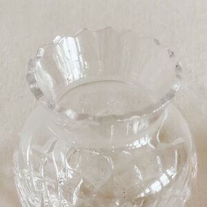 Very pretty vintage mini glass flower vase with a diamond pattern in the glass, and a scalloped rim. This vintage flower vase is in good condition, free of cracks or chips.