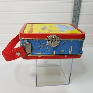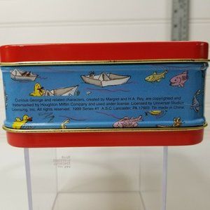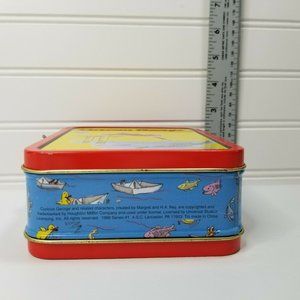 Vintage Curious George Mini Metal Lunchbox Style Fishing Theme Case Woven Handle 1999 Series 1 Houghton Mifflin Co. Licensed by Universal Studios. Size is approximately 5.5" high x 5" wide and about 2" deep. The colors are bright, Red, Yellow, Blue & other Multi-colors in the cute fishing themed design.