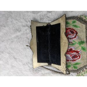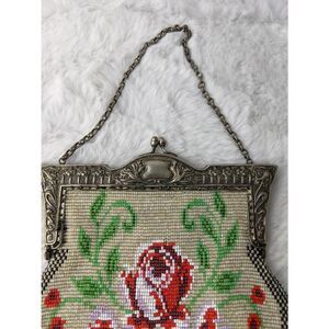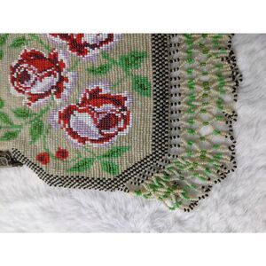 Beaded Purse Beige Floral Red Roses Woven Fringe Silver Frame Kiss lock