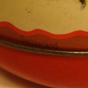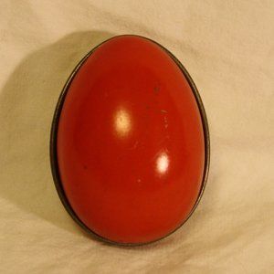 Vintage made in Switzerland egg shaped mini tin. Measures 2.25" long, 1.5" wide, 1.5" tall. Typical wear and tear of a vintage piece, (see photos).