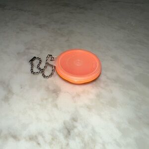 Set of two vintage mini Tupperware container keychains. One container is a white bowl with a pink lid. It is about 2” and the second is an orange bowl with a clear lid. It is about 1.5”.
