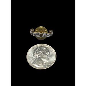 Add a playful touch to your attire with this charming mini brooch pin featuring a white and gold mustache design. The crisp white and gleaming gold tones create a stylish and eye-catching contrast, making this pin a unique accessory for any outfit. For size comparison, a quarter is included in the image, showcasing the brooch's compact yet distinctive presence. This pin is perfect for those who enjoy adding a bit of whimsy and personality to their look.