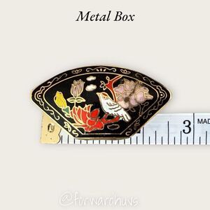 This is a listing for a beautiful metal Asian themed trinket box with lid. This is cloisonné / enamel inlay and is small but beautiful.