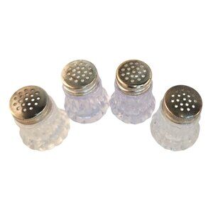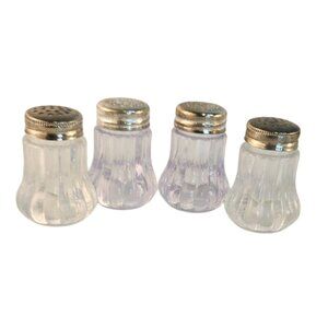 ** This listing features a set of four stunning vintage miniature salt and pepper shakers, each crafted from clear and light lavender fluted glass, adorned with silver-tone screw-on metal lids. Their elegant, ribbed design is perfect for collectors or adding a touch of charm to your dining or display settings. These lovely shakers combine functionality with a touch of vintage aesthetics and are lightweight for easy handling. Each shaker has been examined, and while the lids showcase some patina that adds character, the overall condition is solid for display or gentle use. • Includes a set of 4 shakers