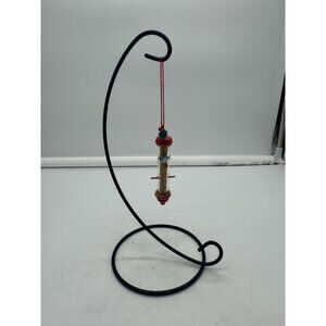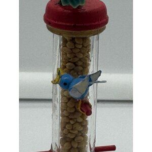 Lovely detailed miniature bird feeder ornament complete with sweet little blue bird perched on it. Approximately 3 1/2 inches long.