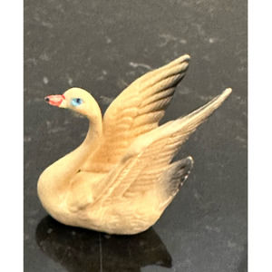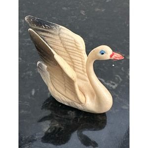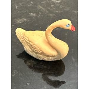 This vintage miniature set features a family of three swans, each with delicate beige color and detailed features. The material used to create these figures is thought to be celluloid, although the exact origin is unknown. This rare collectible item is perfect for bird enthusiasts and collectors alike. The set is in great shape and ready for display in your home or office. The swans are small enough to fit on a tabletop or shelf yet detailed enough to catch the eye of any passerby. The Large Swan is 2.25" Tall and 2" Long, the Medium Swan is 1.25" Tall and 1.75" long and the Small Swan is 0.75" Tall and 0.75" long. Add this unique family of swans to your collection today! Item # 679