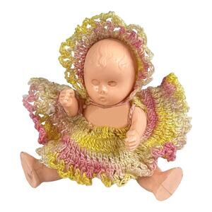 Details: 3" Vintage Miniature Plastic Doll With Jointed Arms and Legs In Crocheted Dress and Bonnet