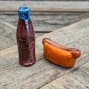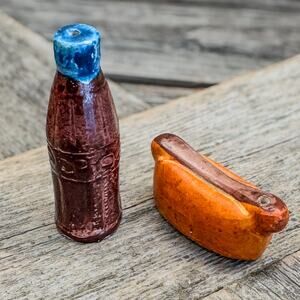 Vintage Miniature Coke Bottle & Hot Dog Ceramic Salt and Pepper Shakers Set Set
