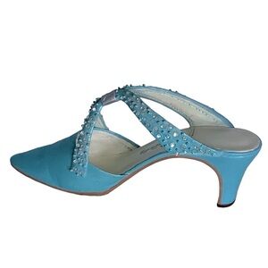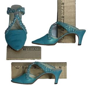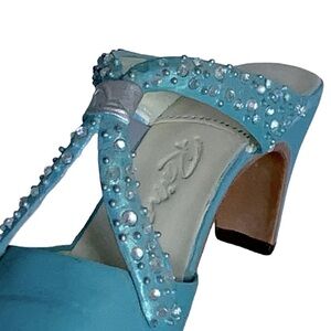 "Society Slide" Model 25604 was a membership shoe is a Raine Original in light blue teal turquoise with sparkling crystals placed all over the straps