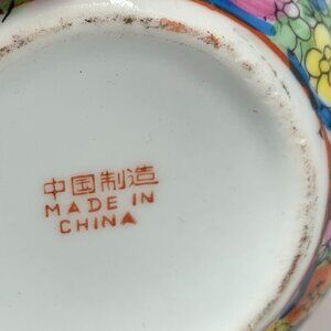 Beautiful Vintage Hand Painted Miniature Fine Porcelain Delicate Tea Set of 9 Pieces. Made in China from fine white porcelain with blue, yellow, green and brown floral design. Set is housed in a protective silk damask covered box and includes one miniature tea pot with lid, 5 5/8” diameter serving tray and 6 matching miniature tumbler-style tea cups. Box is sealed with a strap and ivory colored peg.