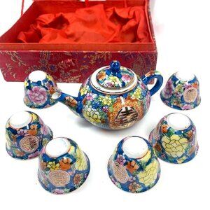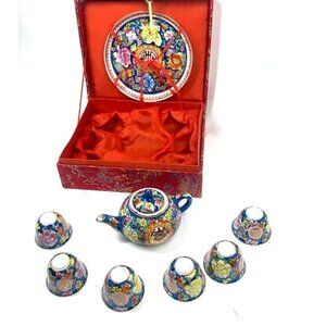 Vintage Miniature Floral Tea Set For 6 Silk Presentation Box Red/Blue Porcelain