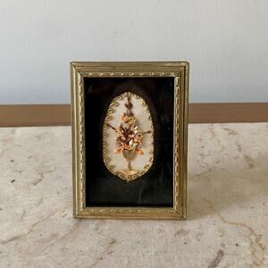 Charming little dried flower bouquet in a mini vase mounted on ivory satin with gold trim detail. This handcrafted vintage item is in a gold tone standing frame. There are floral scrolls all over the frame and tarnishing due to age of item.