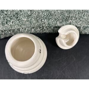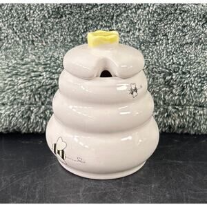 This charming ceramic jar is the perfect addition to any kitchen. Shaped like a beehive and crafted from high-quality ceramic it’s a bright white color, and adorned with cute honey bee's. An ideal honey pot for any lover of the sweet stuff. The jar comes complete with a lid, making it easy to dispense honey onto your toast or into your tea. This honey pot is pre-owned and sadly missing the little spoon, but otherwise in excellent condition. This is tiny but perfect!!