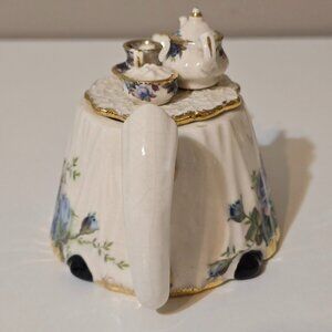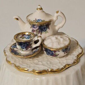 Vintage Miniature Royal Albert Moonlight Rose Tea Pot - Hard to find collectible. Royal Abert Earthenware England 1996. This teapot is a beautiful white with blue roses and gold gilt with the tea set display on top.