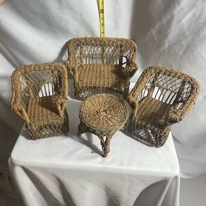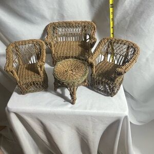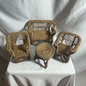 Vintage Miniature Wicker Furniture Set – 4pc Dollhouse Rattan Chairs Table