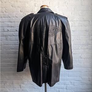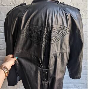 Vintage Minimalist Black Leather Duster Embroidered Biker Moto Goth Trench Coat