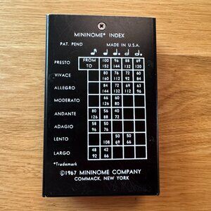 The MININOME is a solid state electronic metronome, portable and adaptable to many uses. It produces an audible click at uniform intervals set by beats per minute, BPM. Small enough to fit in a pocket or hung from a music stand, some even wear around the neck! Ready to maintain a consistent tempo whether practicing or performing. Plug in a headphone or speaker, perfect for musicians and conductors checking tempo.