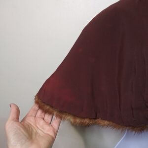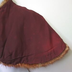 Beautiful vintage, two-tone brown striped mink cape with hook and loop closure down the front. Cape is completely wearable, but does have some loose stitching to the lining around the loop closures due to use. The burgundy lining has a pleat down the center back with x style stitches holding the pleat in place. There's also fading to the lining in spots from wear and age of fabric. Cape measures 28 across at hem, length is approximately 14 1/2 inches from inside back neckline to back hem. Please see all photos, selling as is.