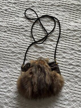 This is a unique vintage piece made from a combination of real Mink & leather. The inside is lined in a plush purple velvet material. A small bag with a long leather strap, it would comfortably hold a lipstick, a few cards and not much else. A truly dainty, feminine accent piece!