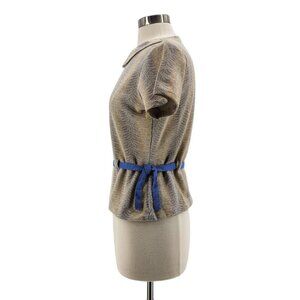 Pullover style short sleeve fitted collared knit shirt top blouse - shade of tan with a blue & white retro pattern. Tie belt that ties on sides. Material has a stretch. Permathal Everglaze Shrink-Controlled.