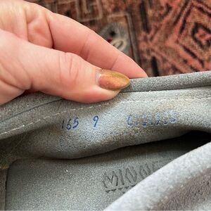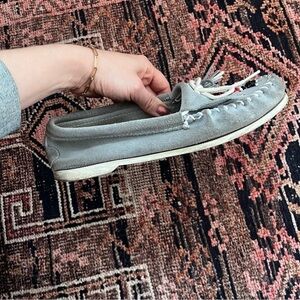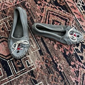 Vintage Minnetonka Light Blue Suede Bird Beaded Fringe Moccasins 9. Light blue suede moccasins with black, red and white beaded bird detail on toe. fringe detail with tie. hard white soles. worn several times with some signs of wear - mostly just dirt or scuffs.