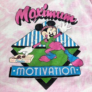 Pink tie dye, Single stitch along hemline and sleeves. Minnie mouse graphic on front with the graphic geometric diamond behind Minnie mouse, lettering maximize motivation, Minnie mouse wearing a crop top and leg warmers right hand reaching for chocolate candies in a box. With the letters maximize motivation. Minnie has a headband on, exercising. Tag marked The Walt Disney Company. Crew neck. Graphic does show signs of age, with some cracking, some discoloration also. Still in great vintage condition. Lightweight t-shirt breathable, thin and comfortable.