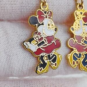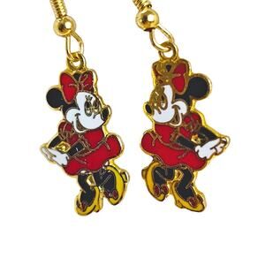 Add a touch of vintage Disney flair with these charming Minnie Mouse dangle earrings. Featuring Minnie in a cute pose, dressed in her classic red bow, red dress, yellow shoes, and white face, these flat earrings are set in gold-toned metal. Made in Taiwan, these earrings are a rare find, crafted during a time when Disney items were manufactured in Taiwan from the 1960s through the 1980s. Perfect for collectors or fans of retro Disney style, these earrings are a delightful addition to any jewelry collection. Order now to own a piece of Disney history!