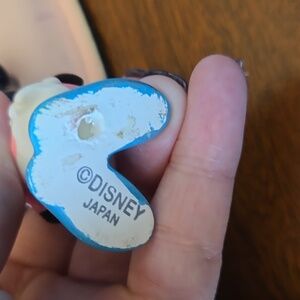 Charming vintage Minnie Mouse figurine wearing a pink polka dot dress and blue shoes. Features a yellow bow and black ears. No callouts, almost 3 inches tall, 2 inches wide at ears.