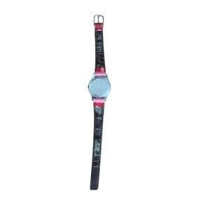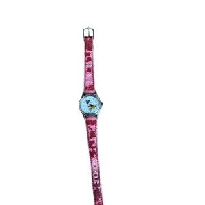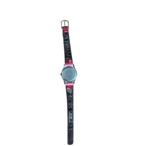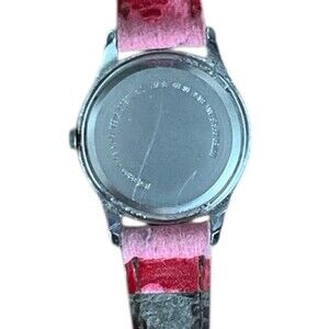 This Vintage Minnie Mouse Lorus Disney Silver Watch V515-6138 is a charming timepiece perfect for any Disney fan. The watch features a classic round design with a silver stainless steel case and a red leather two-piece strap, showcasing the iconic Minnie Mouse logo on the dial. With Arabic numerals and a water-resistant quartz movement, this analog watch also includes a push/pull crown, seconds hand, and is water-resistant up to 30 meters. The polished silver case and buckle closure add a touch of elegance to this casual yet timeless piece, making it a delightful addition to any collection.
