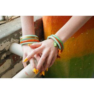 We love the design simplicity of this bangle in mint green with a dark golden brushed striped detail.