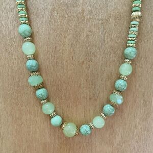 Vintage Mint Green and Gold Single Strand Beaded Necklace with Gold Lobster Clasp and Chain Extension. Necklace measures 18 inches long. Largest bead measures .5 inches. Smallest bead measures .25 inches.