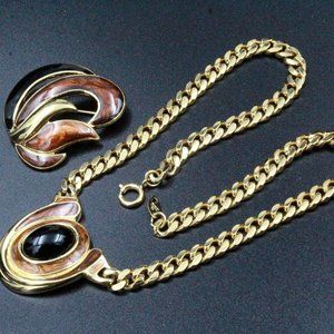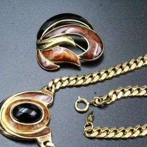 Elevate your style with this exquisite designer jewelry set by Trifari, crafted during the 80's. The set comprises a necklace and brooch, each showcasing stunning craftsmanship and intricate details. The necklace features a captivating pendant, with a black cabochon set on a beautifully designed gold tone metal base. The brooch, also made of gold tone metal, boasts remarkable cut-out designs and accents of brown enameling. Marked with the iconic "TRIFARI TM" signature, this set is in impeccable mint condition, ready to add a touch of sophistication to your collection. The necklace measures 17" in length, with the pendant measuring 1 1/2" long by 1 1/4" wide, while the brooch measures 1 3/4 square inches, making this set a true statement of elegance and style.