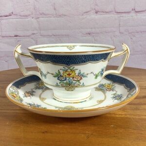 Vintage Minton Isis Blue Double Handled Footed Soup Bowl and Saucer Set