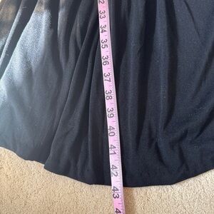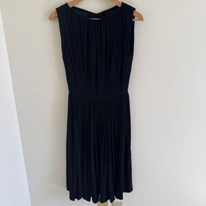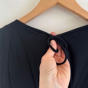 This is a perfect black dress. Sleeveless. Soft material cut out detail in back. full skirt. It looks like something Betty Draper would wear 😊